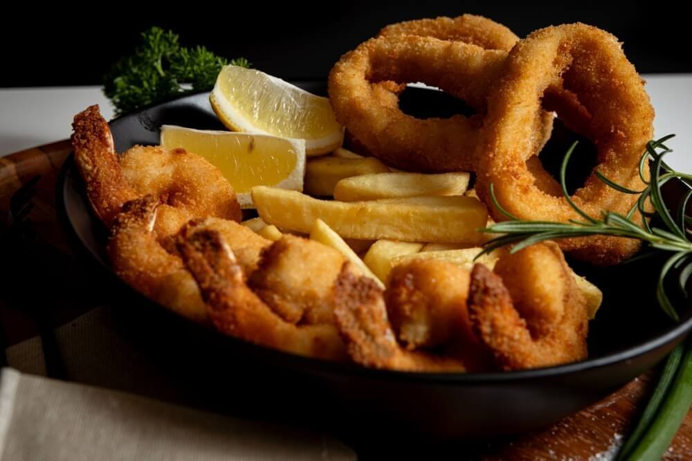 5 crumbed calamari, 5 crumbed prawns, served on a bed of chips