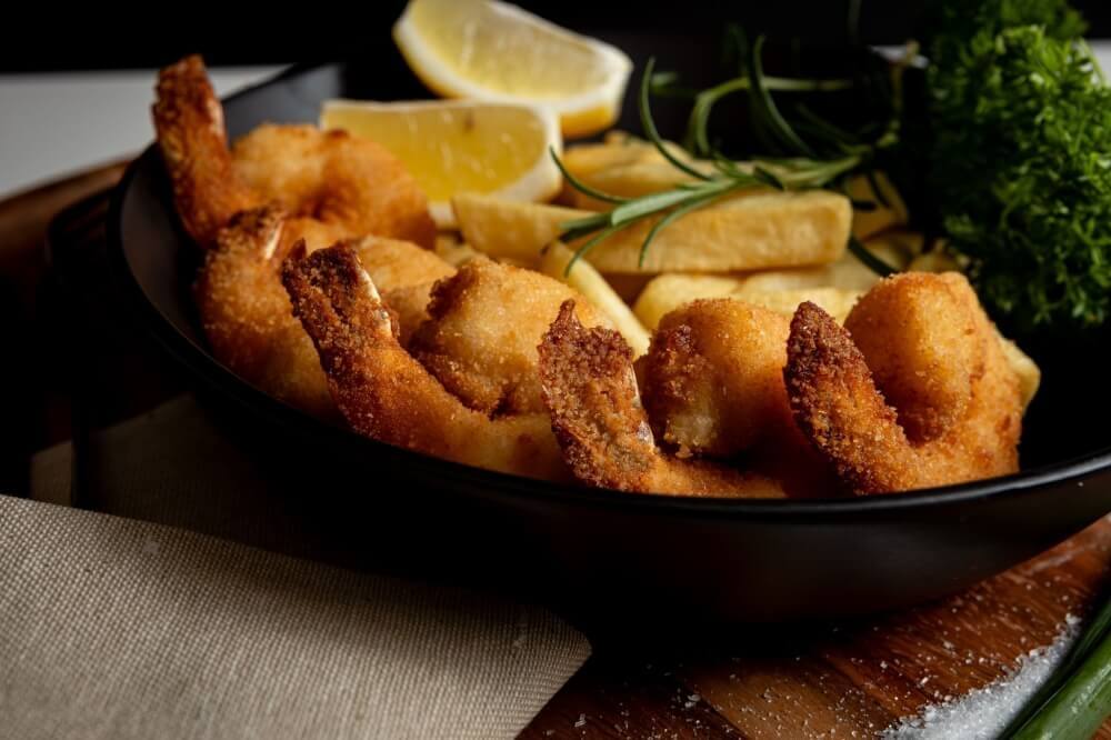 10 crumbed prawns served on a bed of chips