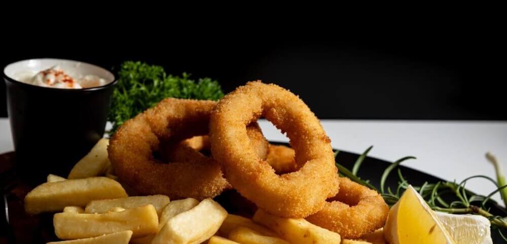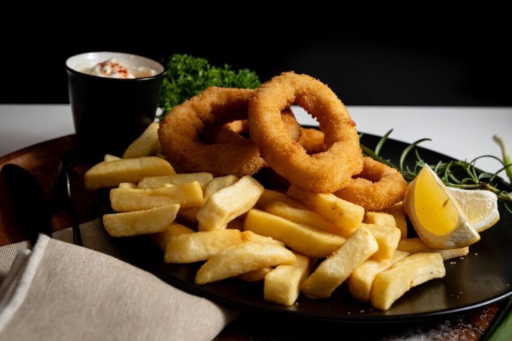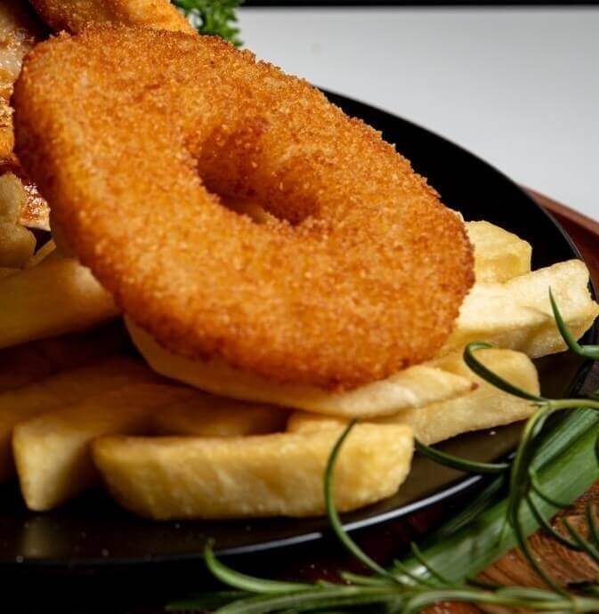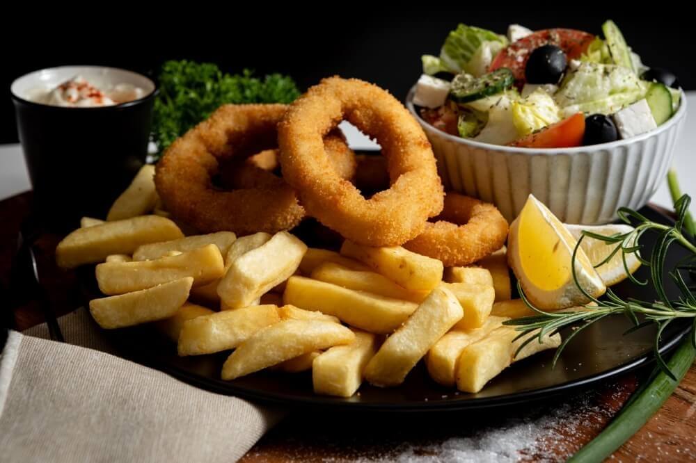10 calamari rings, served on a bed of chips with a small salad of your choice