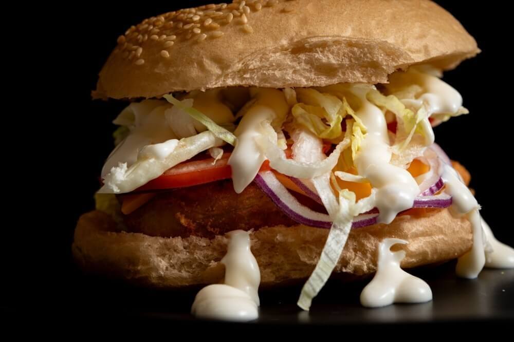 Crumbed chicken breast schnitzel, topped with cheese, lettuce, tomatoes, onions & Cha Cha's mayo in a sesame seed bun
