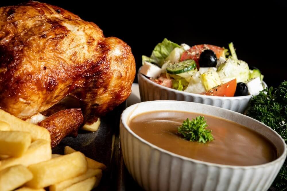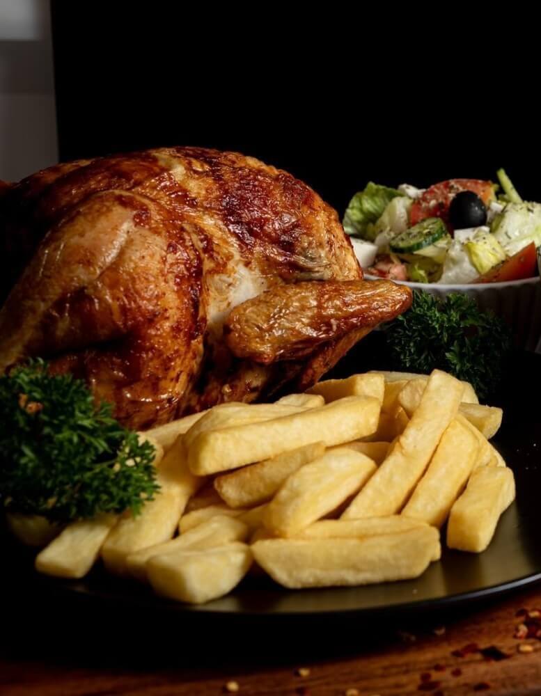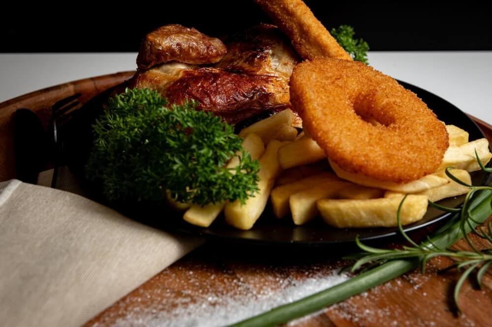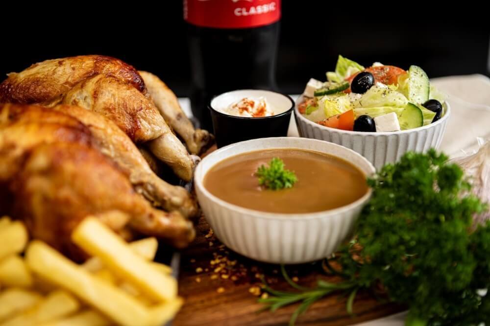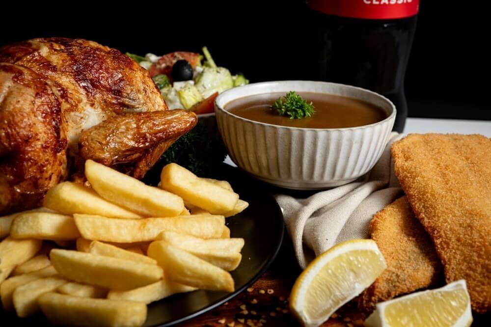 1 whole chicken, 2 crumbed fish fillets of your choice, 1 large chips, 1 large gravy, 1 large salad, 1.25 drink