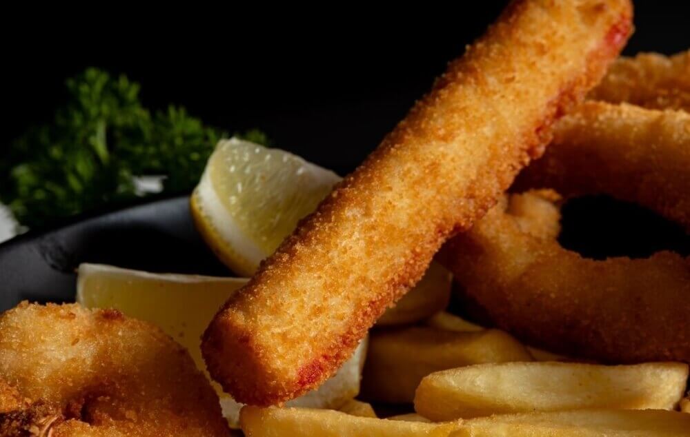 4 crumbed prawns, 4 crumbed calamari rings, 4 crumbed seafood sticks, served on a bed of chips