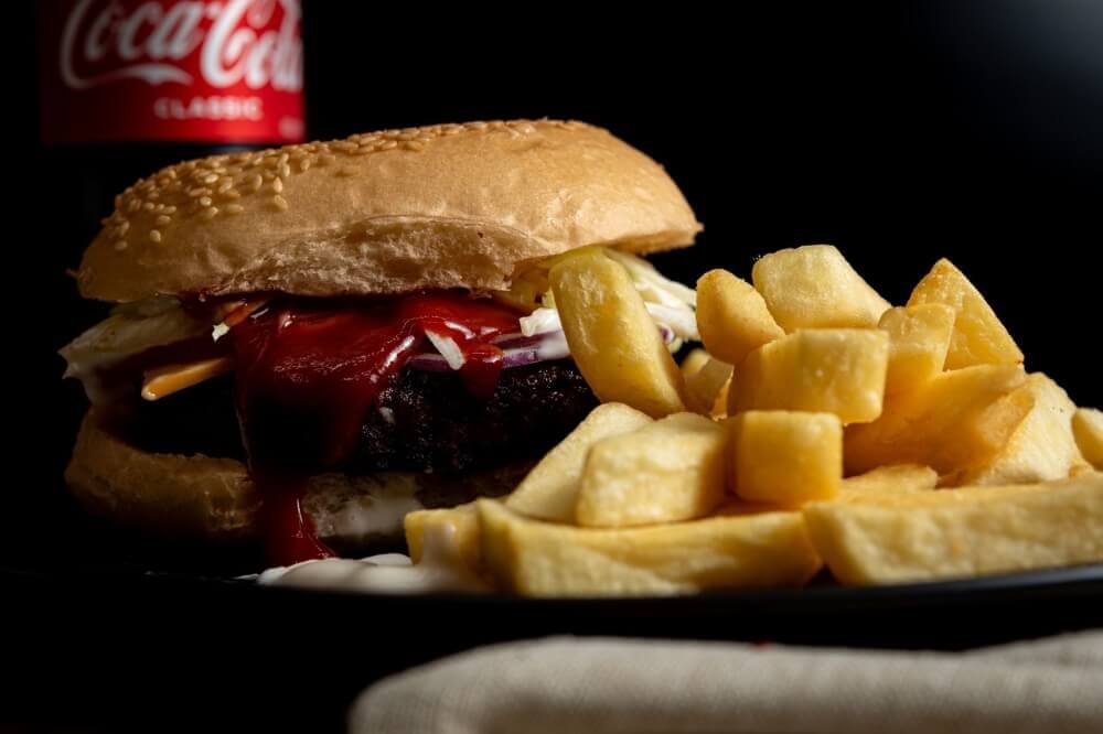 Beef patty with cheese, lettuce, tomatoes and onions, topped with tomato sauce in a sesame seed bun with a side of chips and choice of 600ml drink
