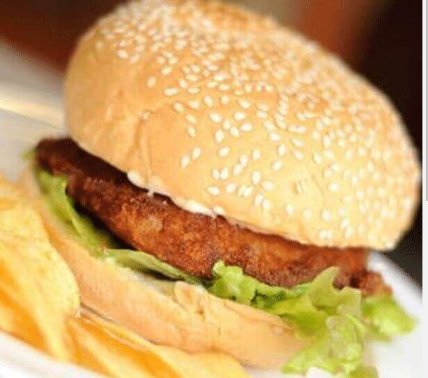 Crumbed chicken breast fillet, topped with cheese, lettuce, tomatoes, onions & Cha Cha's mayo in a sesame seed bun